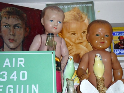 Des plaques émaillées aussi, « NM 36, la Baie d’Along », « Lait pasteurisé à 40 centimes », « Interdiction d’entrer sans bottes »… sans oublier le panneau de signalisation des années 60 représentant la micheline qu’elle regardait passer, enfant, avec ses grands-parents.