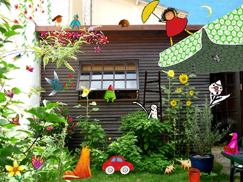 En face de son appartement : un petit jardin avec un cabanon. Lilas, framboisiers, groseilliers, olivier, laurier-rose… Merles, moineaux, rouges-gorges… et sa tortue, Fantômette. L’été, Claire s’y installe pour écrire. Quand il pleut, elle se réfugie dans le cabanon – à la « Le Corbusier ». Même poésie que dans son appartement : photos, portraits. Toujours Françoise Sagan, Pagnol mais aussi … Jacques Prévert, Frédéric Dard, Jean Giono, Paul Léautaud, Bernard Pivot, Jean Ferrat, Amélie Nothomb, … des tableaux encore, des objets amusants achetés dans des vide-greniers dont elle raffole.