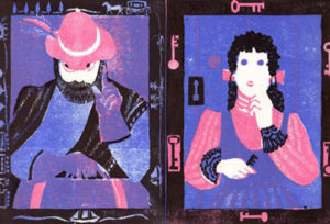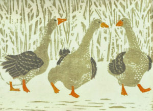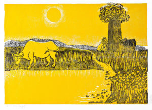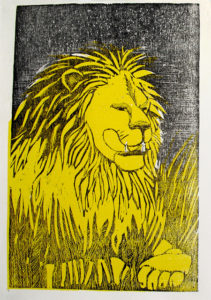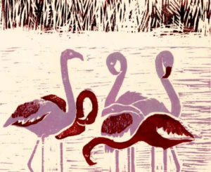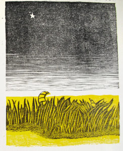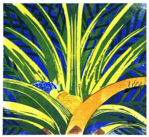 D’une adresse singulière dans le coup de gouge, à la fois précis et énergique, elle est virtuose dans l’usage de la couleur, jouant harmoniquement des superpositions d’encres et utilisant subtilement, dans ses compositions, les aspérités et veines du bois de fil.